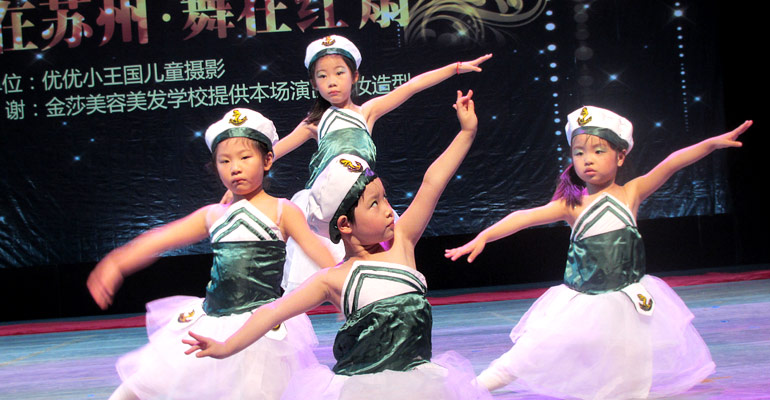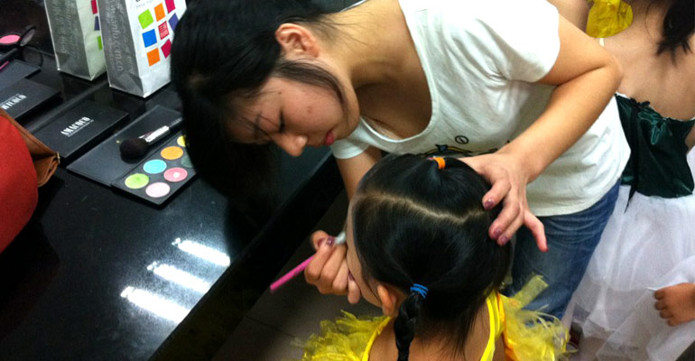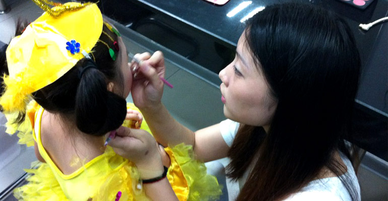 7月15日,由苏州学校化妆班学生组成的化妆团队赶往苏州工业园区独墅湖影剧院,为在那里举行的“第六届苏州市少儿艺术节——家在苏州舞在红扇”舞蹈专场的小朋友们提供化妆服务。