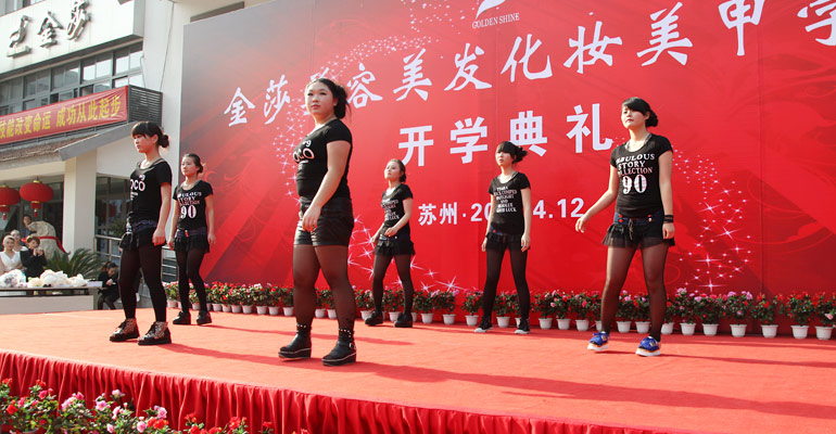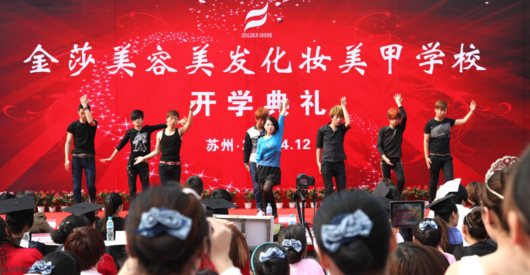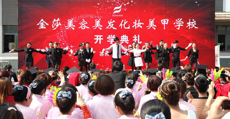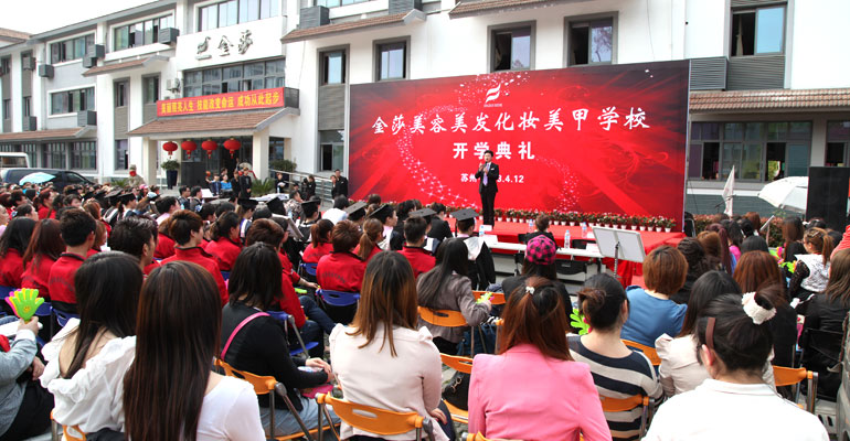 2013年4月12日下午2点30分,苏州金莎美容美发化妆学校400名师生兴高采烈、精神抖擞地汇聚于学校内广场。随着以班级为单位的八个方阵集合完毕,在全体老师欢快的载歌载舞中拉开了开学典礼的帷幕。