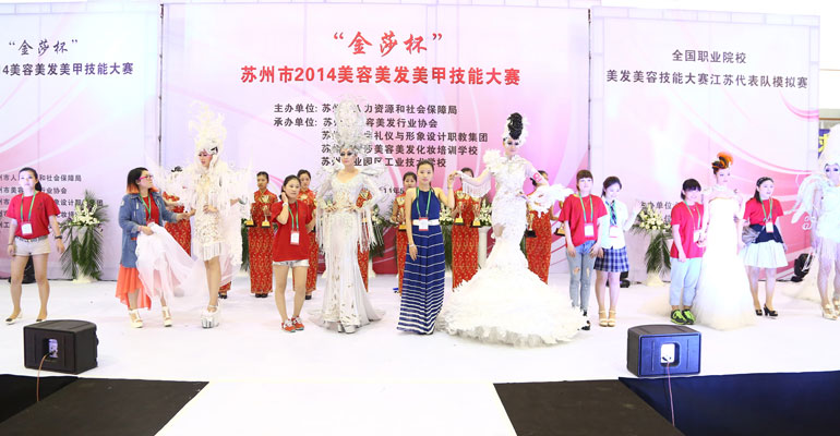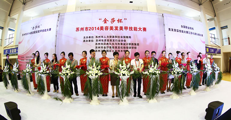 由苏州市人力资源和社会保障局主办, 苏州市美容美发行业协会、苏州市庆典礼仪与形象设计职教集团、苏州市金莎美容美发化妆培训学校、苏州工业园区工业技术学校联合承办的“金莎杯” 苏州市2014美容美发美甲技能大赛于2014年5月23日在苏州工业园区工业技术学校体育馆隆重举行。来自主办单位、承办单位及中美协、省美协、各兄弟协会的领导,全省美容美发化妆美甲行业的朋友们、参赛选手、模特等2000多人参加了此次盛会。