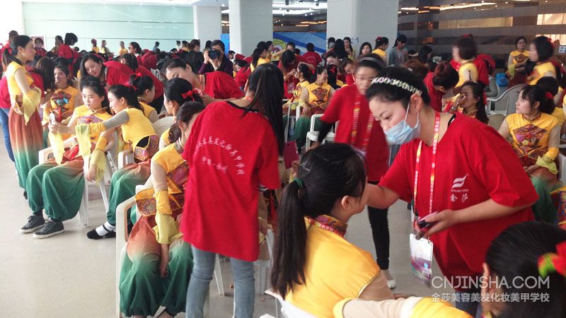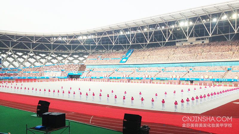 2014江苏省第十八届运动会于9月19日在徐州奥体中心开幕,金莎学校成为了本次开幕式的唯一指定造型单位,学校的全体师生从19日早晨对开幕式演员进行化妆造型工作。